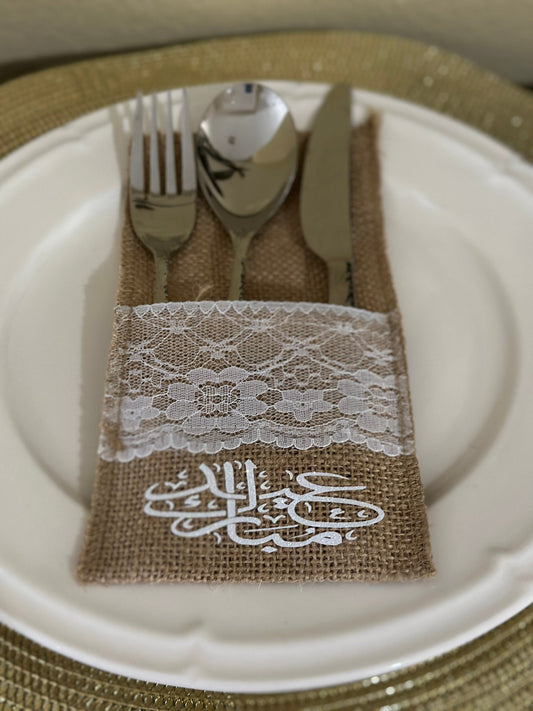 Customized Burlap Silverware Holders with White Lace